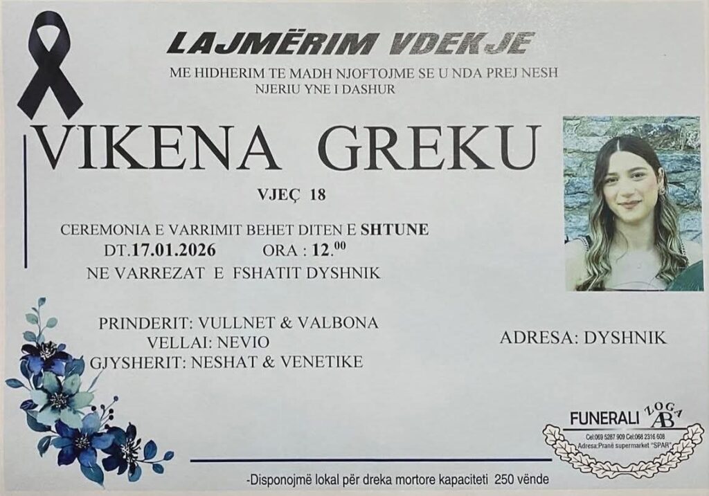 Përcillet sot për në banesën e fundit Vikena Greku, 18 vjeçe, e cila humbi jetën tragjikisht në aksidentin e rëndë rrugor të ndodhur mbrëmjen e 15 janarit, pranë urës së Dajlanit në Durrës.
