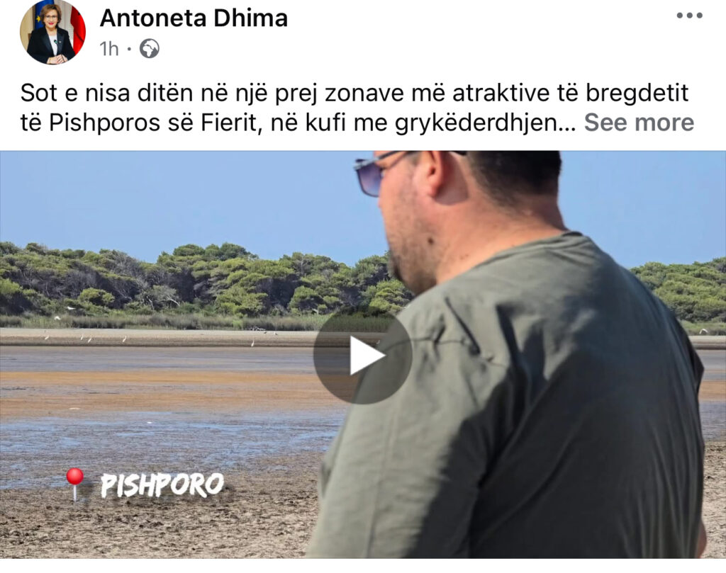 Fier, 16 Korrik 2025 – Deputetja e Qarkut Fier, znj. Antoneta Dhima, ka reaguar sot nga terreni pas disa raportimeve të pasakta në media që pretendonin për ndotje me naftë në zonën e Pishporos, pranë grykëderdhjes së lumit Vjosë. Reagimi i saj erdhi përmes një tjetër videoje dhe postimi të detajuar, ku shpjegoi se ajo që u interpretua si ndotje është në fakt një fenomen natyror: ligatina të errëta të krijuara nga mungesa e reshjeve dhe tërheqja e detit.