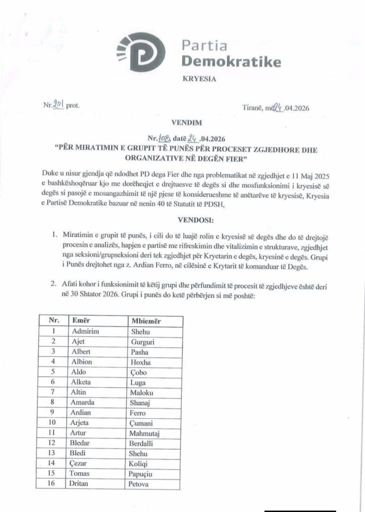 Gjendja në Partia Demokratike në Fier duket se ka hyrë në një fazë të re organizimi, ku zgjedhjet zëvendësohen me emërime dhe listat me korrigjime rrugës. Me vendim të firmosur nga Sali Berisha dhe Flamur Noka, dega e Fierit nuk do të shkojë në zgjedhje për kryetar, por do të drejtohet nga një grup pune me 43 anëtarë.