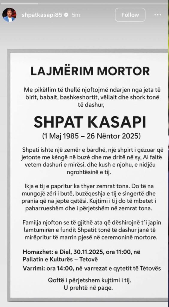 Shpat Kasapi, i cili ndërroi jetë në moshën 40-vjeçare, si pasojë e një ataku në zemër, do të përcillet nesër për në banesën e fundit.