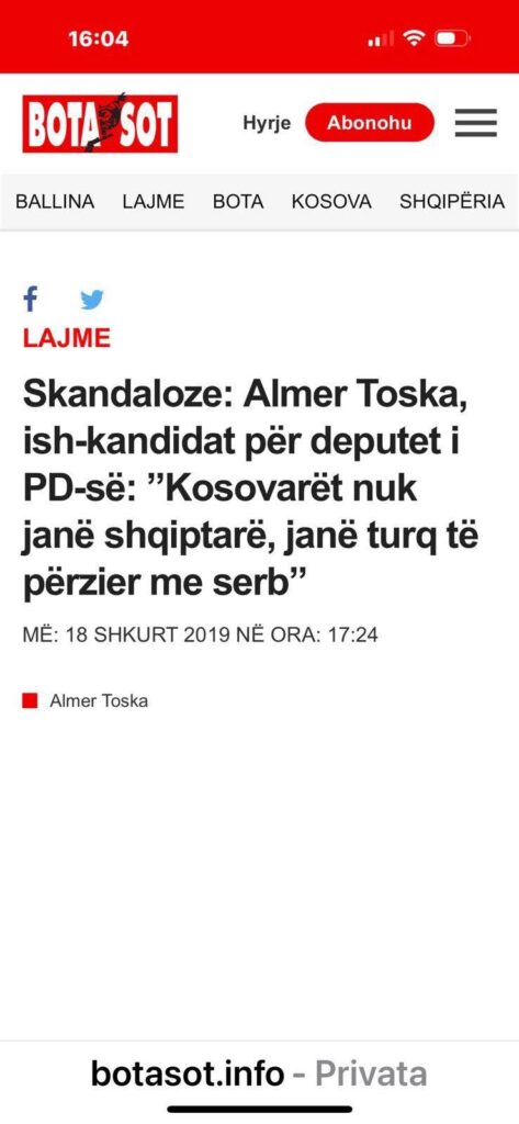 Indinjata ime e thellë ndaj ketij pseudogazetari e shprehur në atë formë ka qënë pasi ky pseudogazetar ka guxuar të shkruaj po ashtu për gjysmën e Kombit tonë Kosovën. Mirepo ajo që është shumë indikative dhe e pështirë në gjithë këtë histori, është fakti se, ka guxuar te shprehë se “ne Kosovarët jemi gjysem Turq e gjysem Sllavë”. Eshtë sa irrituese po aq edhe e neveritshme dhe si e tillë kam reaguar në atë formë pasi rrënjët e mija burojnë në Mitrovicë të Kosovës por jam i lindur dhe i rritur ne qytetin e Fierit. Familja jonë dhe shumë të tjera janë vendosur ne Shqipëri që nga periudha e Isa Boletinit ku kanë kontribuar në ngritjen e Flamurit dhe formimin e Qeverisë së parë Shqiptare, pjesë e së cilës kanë qenë familjarë tanë të cilët kanë kontribuar duke pasur edhe humbje në radhët e tyre.