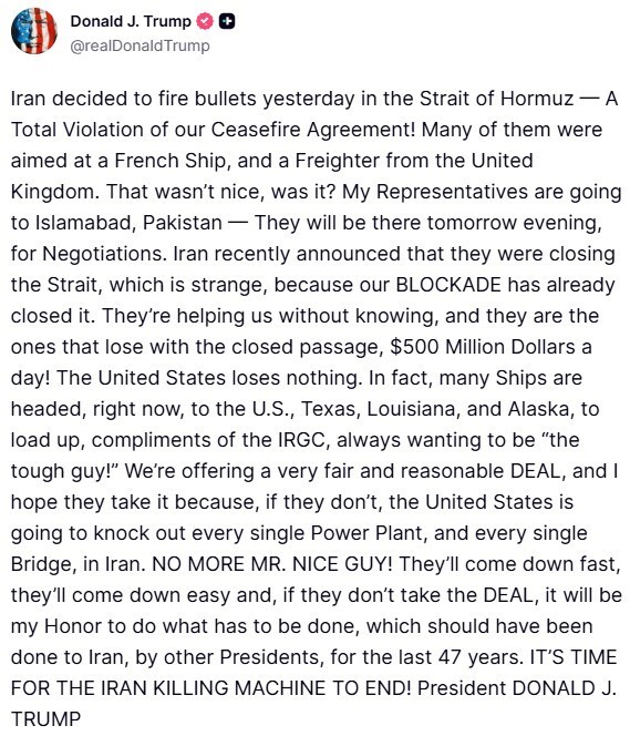 “Irani vendosi të qëllojë dje me plumba në Ngushticën e Hormuzit – Një shkelje totale e Marrëveshjes sonë të Armëpushimit! Shumë prej tyre kishin për qëllim një anije franceze dhe një anije mallrash nga Mbretëria e Bashkuar. Kjo nuk ishte mirë, apo jo? Përfaqësuesit e mi do të shkojnë në Islamabad, Pakistan – Ata do të jenë atje nesër në mbrëmje, për negociata. Irani njoftoi së fundmi se po e mbyllte Ngushticën, gjë që është e çuditshme, sepse BLLOKADA jonë e ka mbyllur tashmë. Ata po na ndihmojnë pa e ditur, dhe janë ata që humbasin me kalimin e mbyllur, 500 milionë dollarë në ditë! Shtetet e Bashkuara nuk humbasin asgjë. Në fakt, shumë anije po shkojnë, tani, drejt SHBA-së, Teksasit, Luizianës dhe Alaska, për t’u ngarkuar, komplimente të IRGC-së, duke dashur gjithmonë të jenë “djali i fortë!” Ne po ofrojmë një MARRËVESHJE shumë të drejtë dhe të arsyeshme, dhe shpresoj që ta pranojnë sepse, nëse nuk e bëjnë, Shtetet e Bashkuara do të shkatërrojnë çdo termocentral dhe çdo urë në Iran. JO MË Z. DJALI I MIRË! Ata do të rrëzohen shpejt, do të rrëzohen lehtë dhe, nëse nuk e pranojnë MARRËVESHJEN, do të jetë nderi im të bëj atë që duhet bërë, të cilën duhet t’ia kishin bërë Iranit presidentët e tjerë, gjatë 47 viteve të fundit. ËSHTË KOHA QË MAKINA VRASËSE E IRANIT TË MARRË FUND! Presidenti DONALD J. TRUMP”, shkruan Trump.