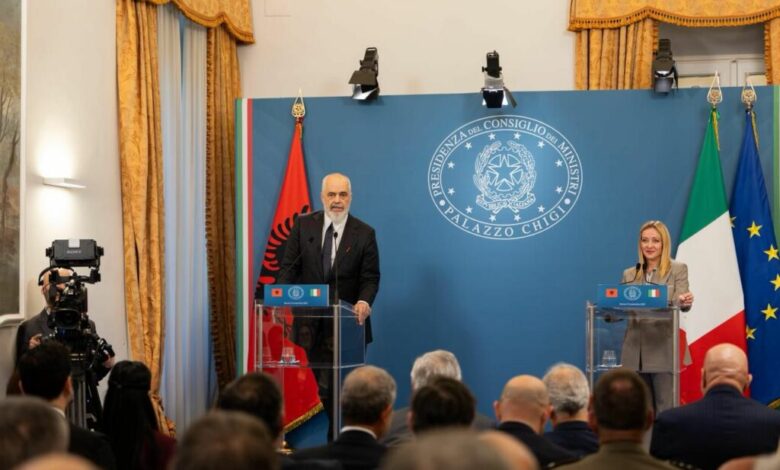 Kryeministri Edi Rama u shpreh gjatë konferencës së përbashkët për shtyp me homologen e tij italiane, Giorgia Meloni se Shqipëria është gati të futet në BE edhe pa të drejtë vetoje. Madje ai tha se Shqipëria mund të përfaqësohet nga Komisari Europian Italian.