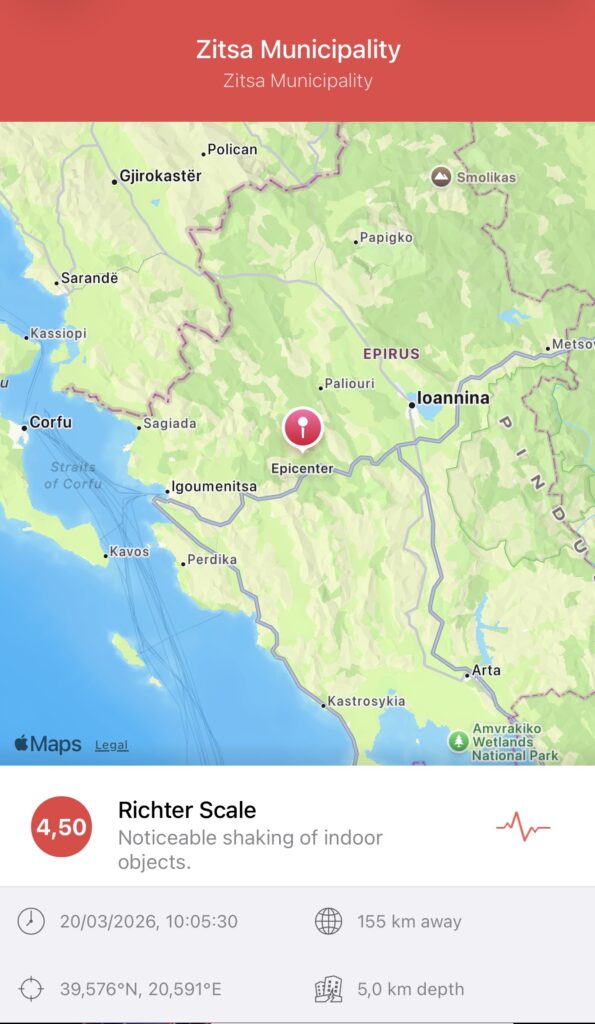 Sipas të dhënave paraprake, lëkundja sizmike ka ndodhur më 20 mars 2026, rreth orës 10:05, me një thellësi prej 5 kilometrash. Epiqendra është lokalizuar në një zonë pranë qytetit të Ioanninës, rreth 155 kilometra larg.