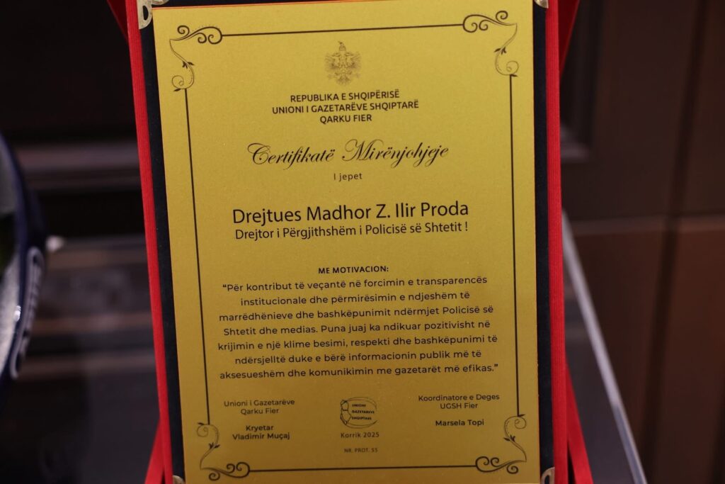 Unioni i Gazetarëve Shqiptarë, dega e qarkut Fier, ka vlerësuar me Certifikatë Mirënjohjeje Drejtorin e Përgjithshëm të Policisë së Shtetit, Drejtues Madhor Ilir Proda, për bashkëpunimin e shkëlqyer, transparent dhe në kohë, mes Policisë dhe medias, duke e cilësuar këtë marrëdhënie si një model me standarde europiane në funksion të interesit publik.