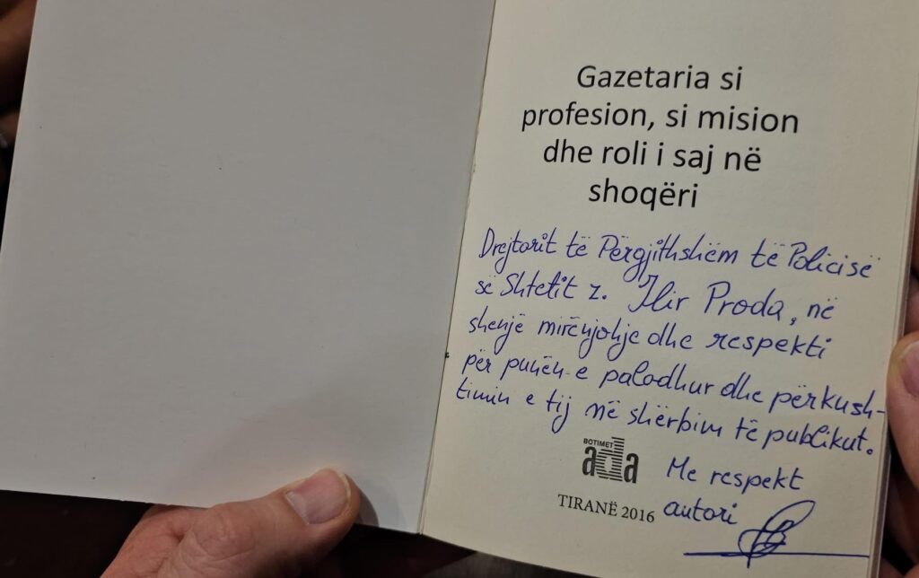 “Gazetarët janë gur themeli i shoqërisë, ura lidhëse mes Policisë dhe qytetarëve, syri dhe veshi i tyre, por edhe pasqyra ku ne shohim punën tonë. Shpeshherë jeni edhe oponenca konstruktive që na ndihmon të përmirësohemi. Transparenca dhe marrëdhënia korrekte me median nuk janë vetëm detyrim ligjor, por kulturë pune dhe bindje personale. Ky standard komunikimi do të mbetet gjithmonë prioritet i Policisë së Shtetit”, – u shpreh Proda, duke shtuar se tashmë ekziston një protokoll sigurie për mbrojtjen e gazetarëve dhe një pikë kontakti që ndjek çdo denoncim apo shqetësim të tyre.